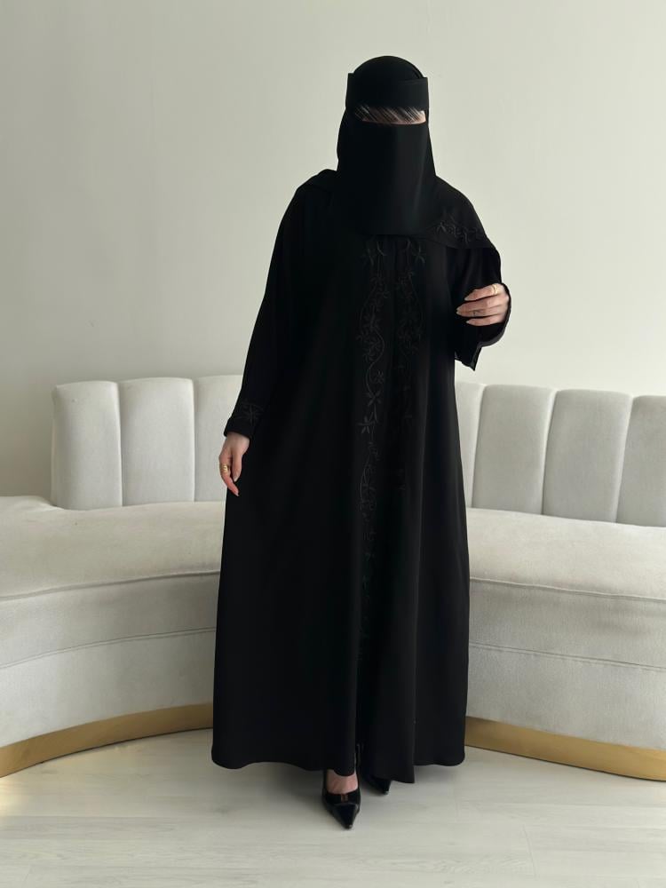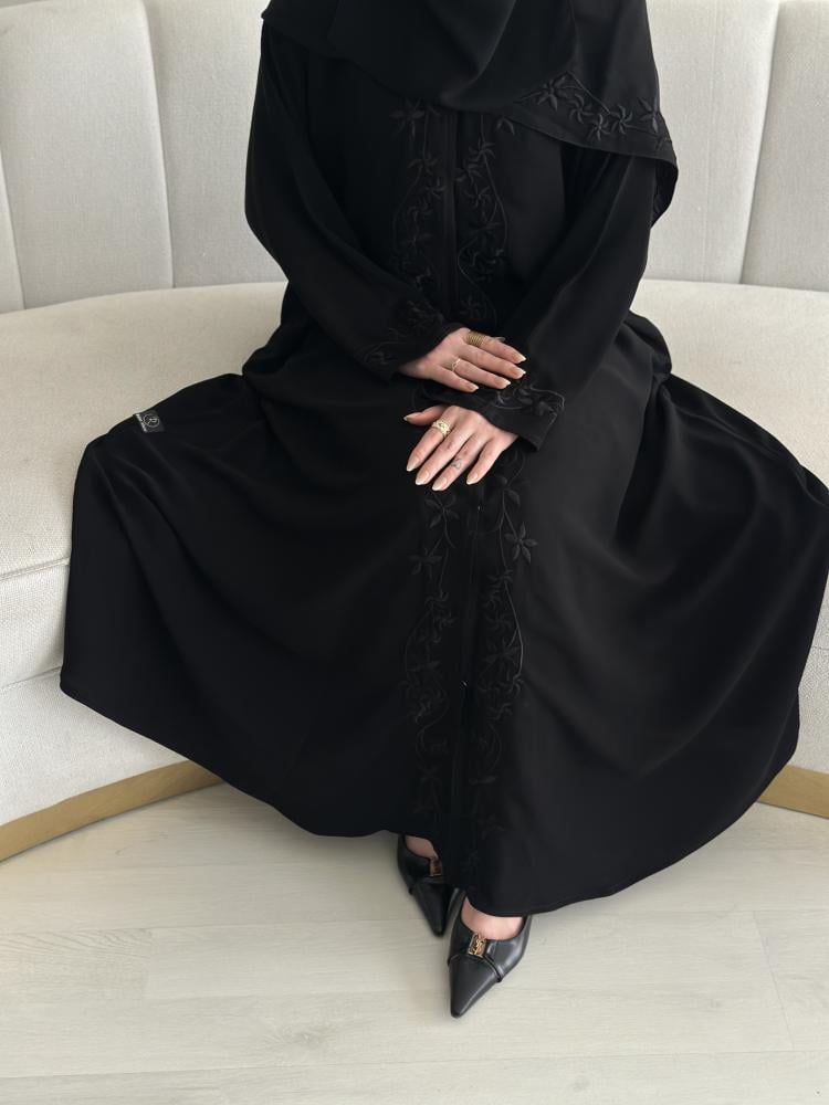 عباية بتطريز ورد انيق في امام العباية كامل والأكمام مما يزيد من روعة العباية وتجعلها مناسبة للمناسبات الخاصة واليومية