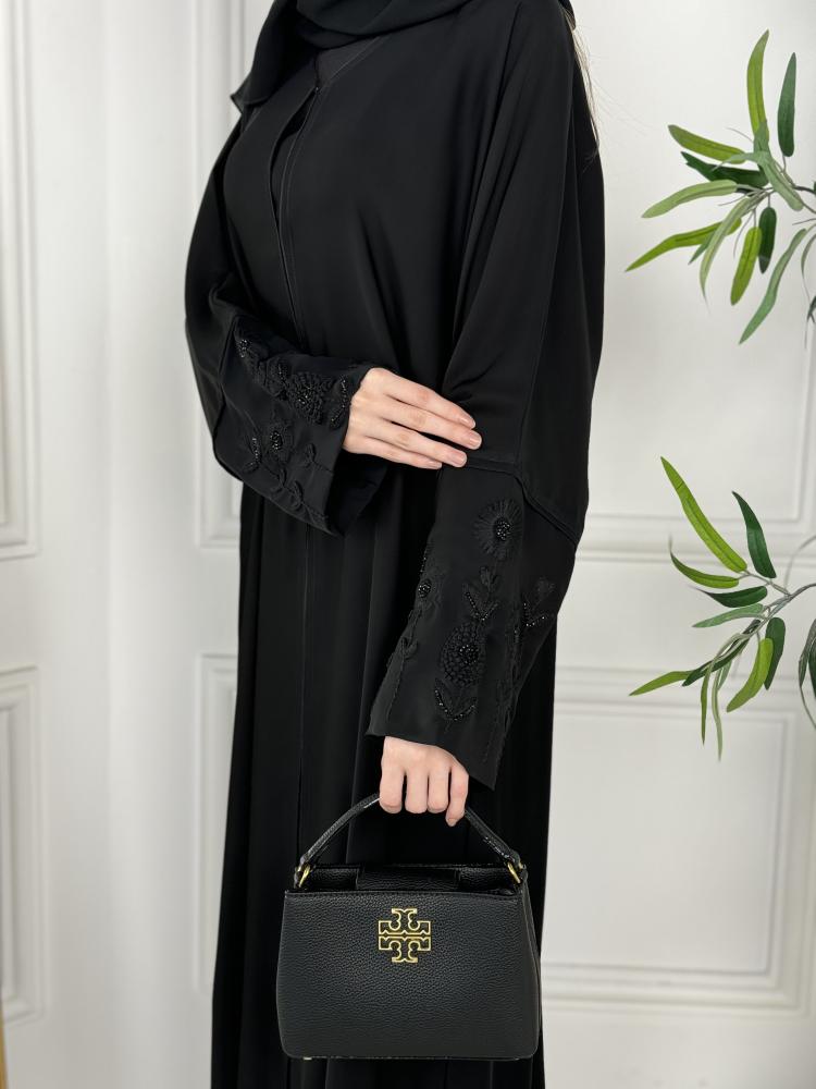 عباية بتصميم شك خرز وصوف تتميز العباية بشك الخرز الناعم والصوف على الاكمام التي تزيد من روعة العباية وتجعلها مناسبة للمناسبات الخاصة